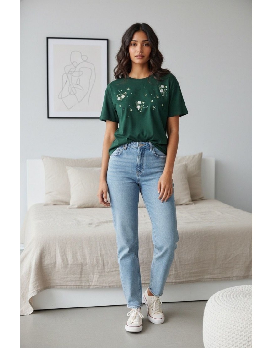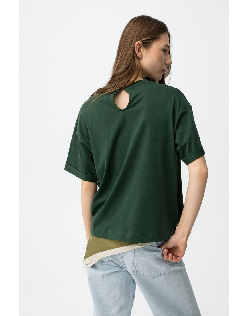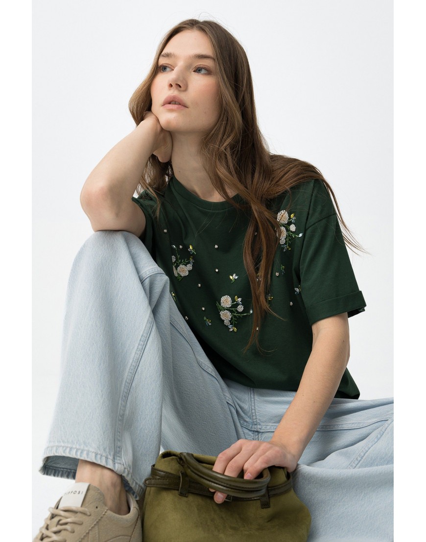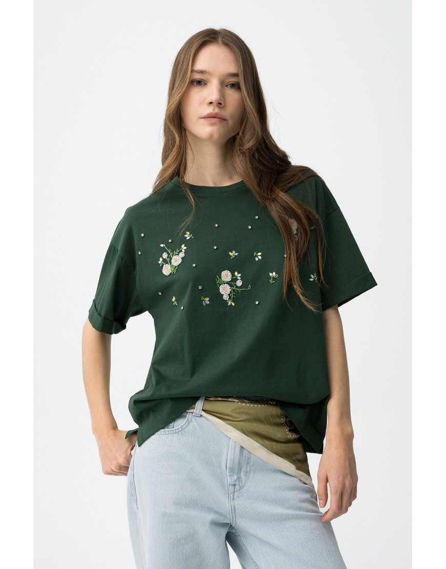 Diancie Camiseta verde oscuro, corte amplio, manga corta, estampado floral y abertura trasera redonda visible.100% COTTON