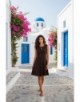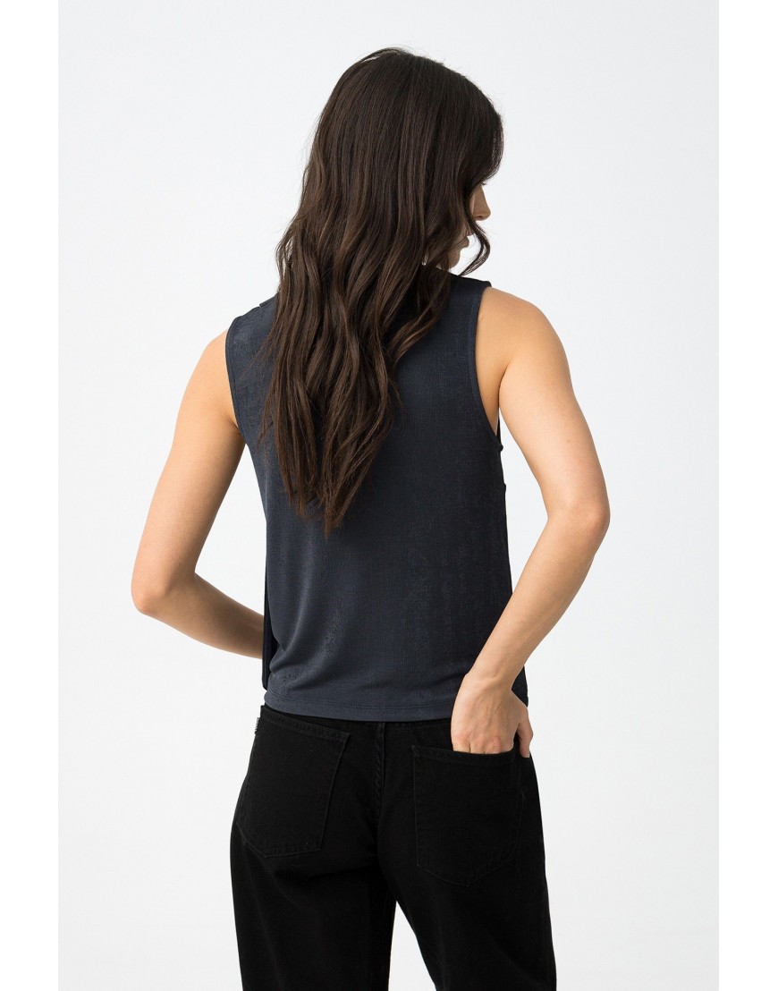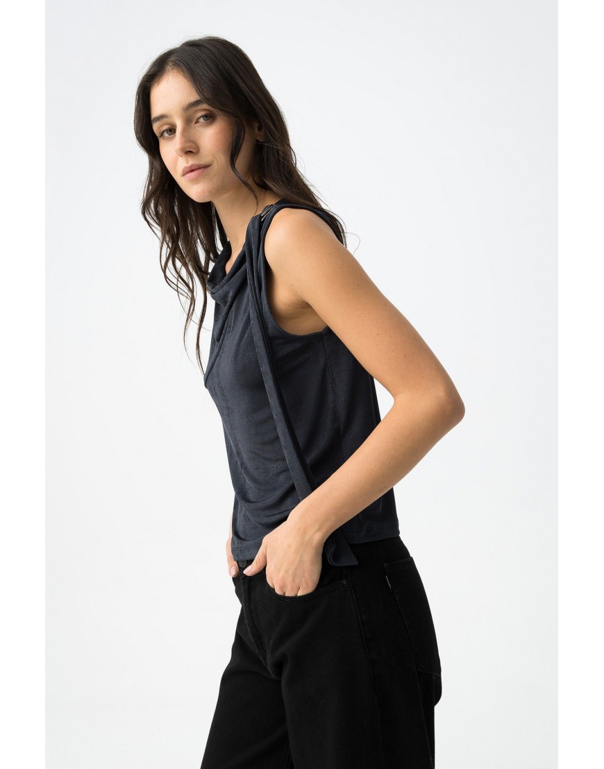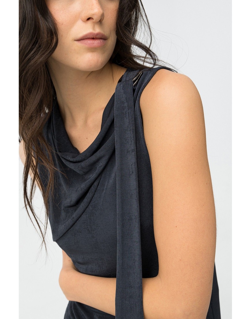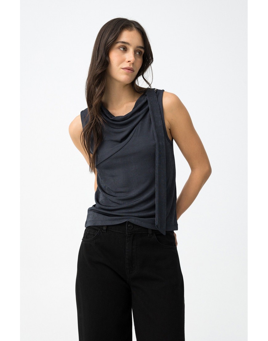 Waterly Top azul oscuro, corte slim, sin mangas, escote drapeado y detalle de cinta lateral visible.97% POLYESTER 3% ELASTANE