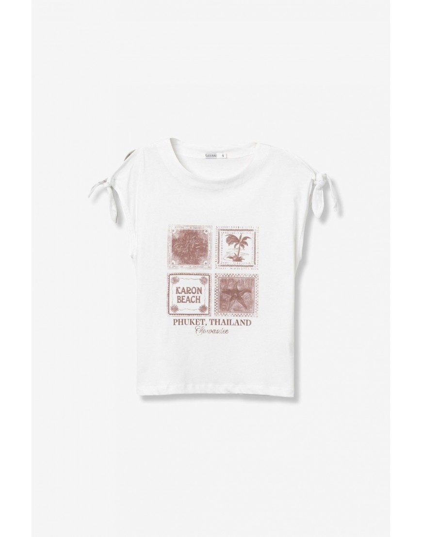 Meloetta Camiseta de color crudo, corte regular, lazos en mangas y estampado retro en tonos tierra delante.100% COTTON