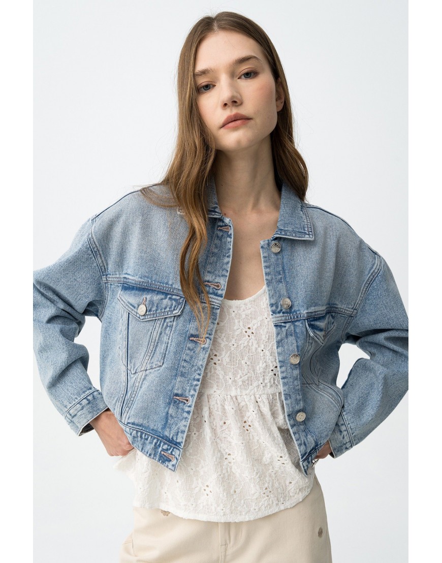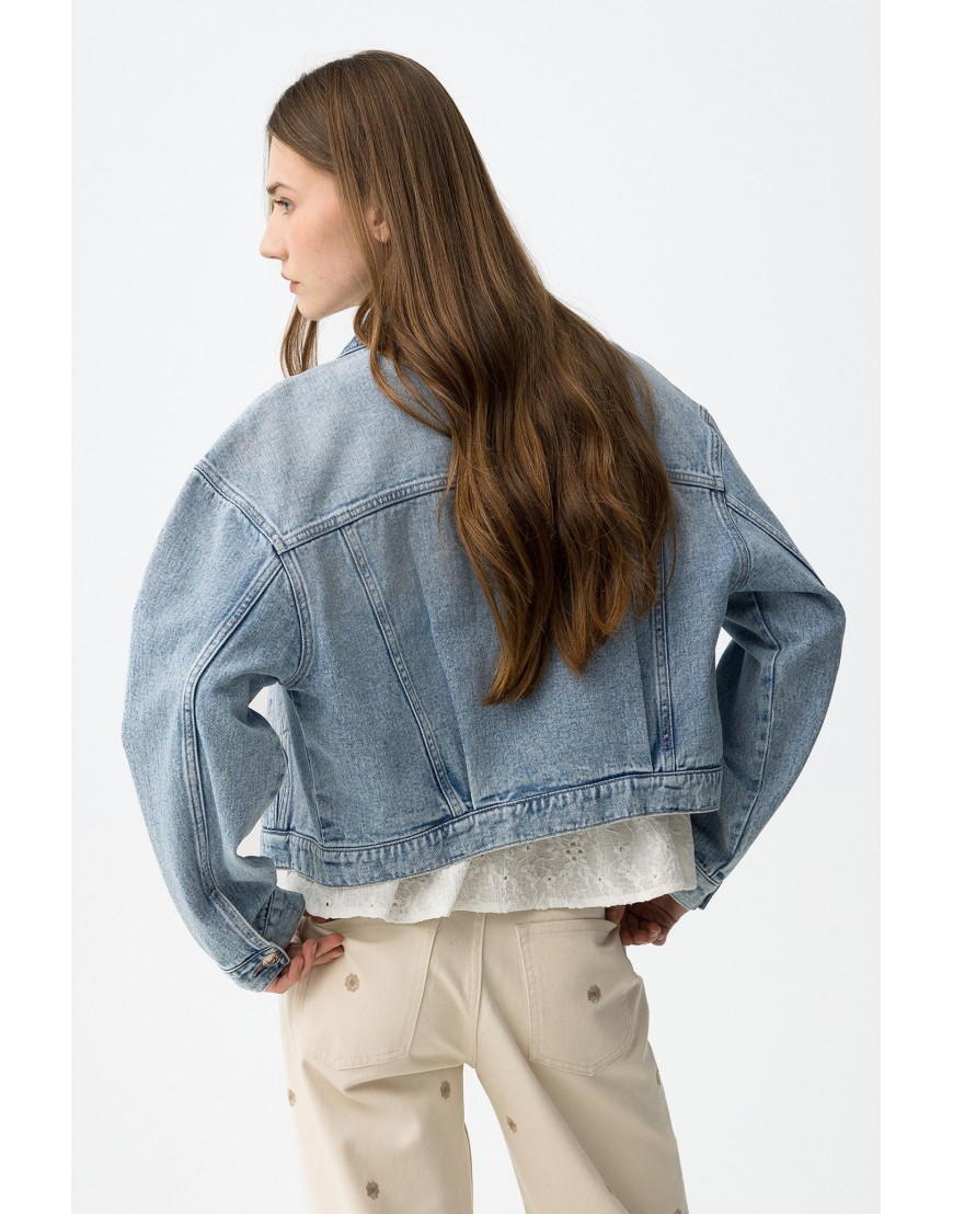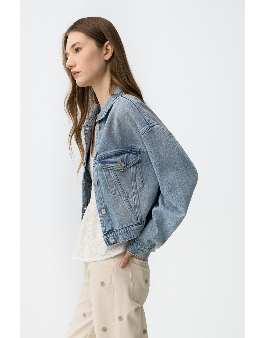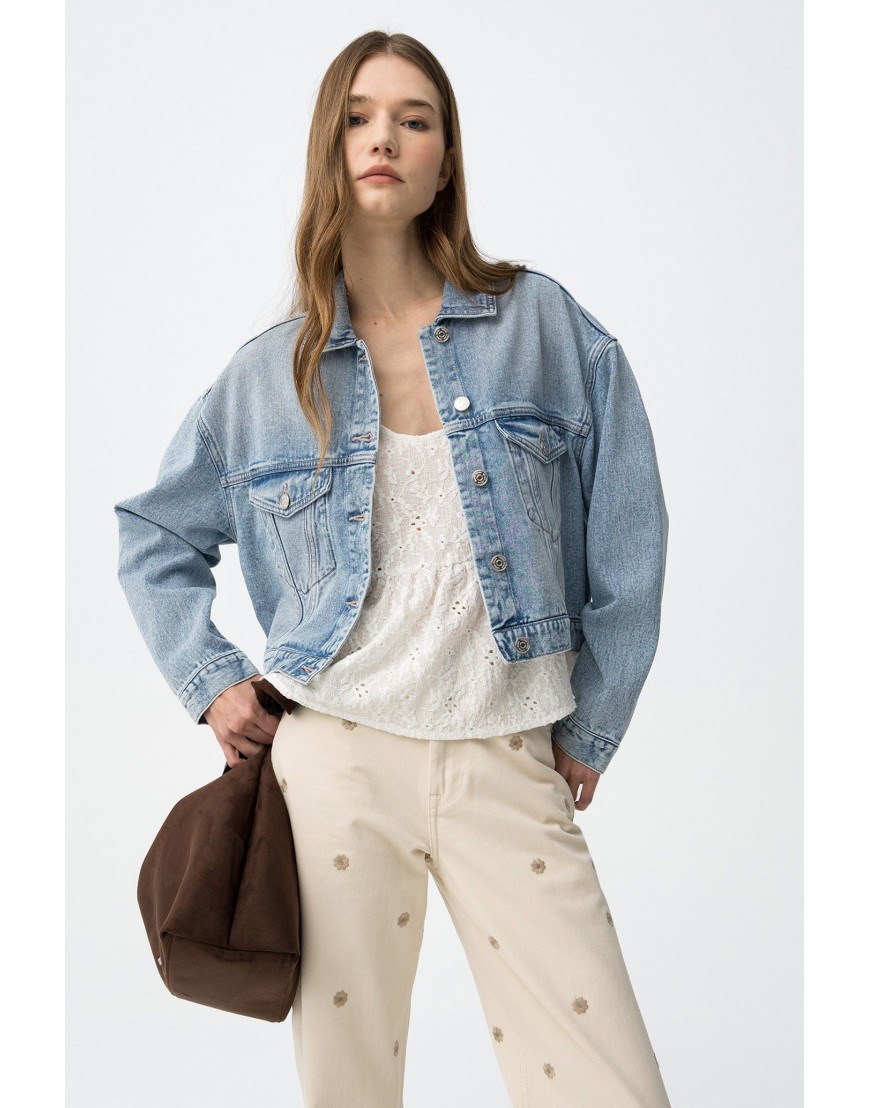 Corte recto, estilo oversize, con bolsillos delanteros y botones metálicos, en azul claro lavado.100% COTTON