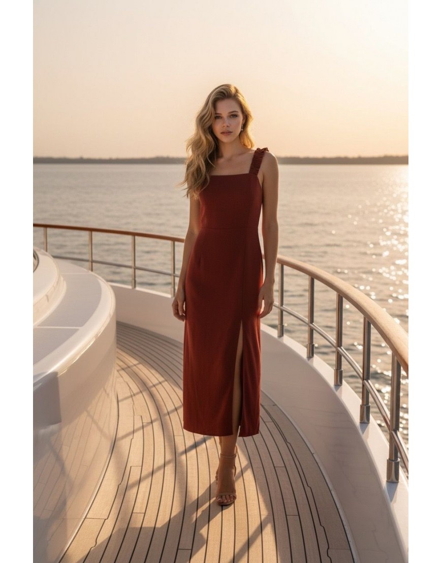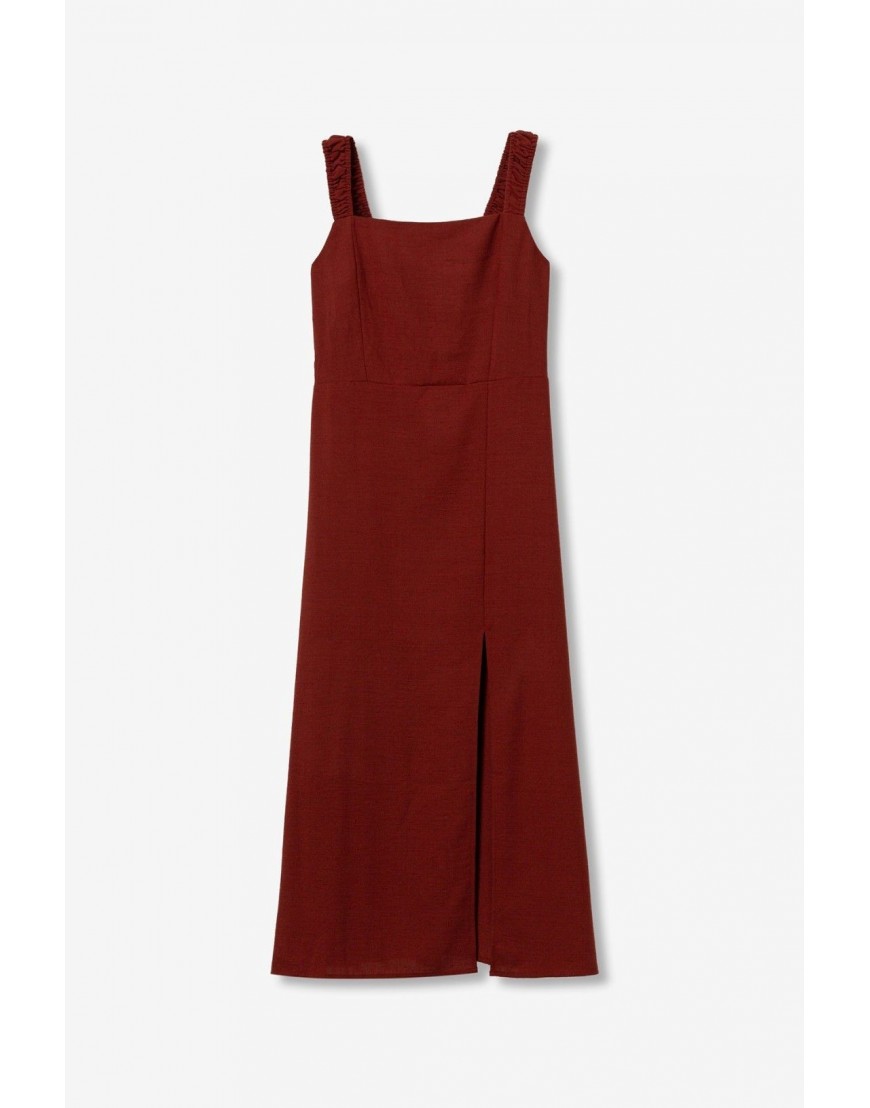 Olinda Vestido de color rojo, corte midi regular, tirantes anchos fruncidos y abertura discreta en la falda.100% POLYESTER