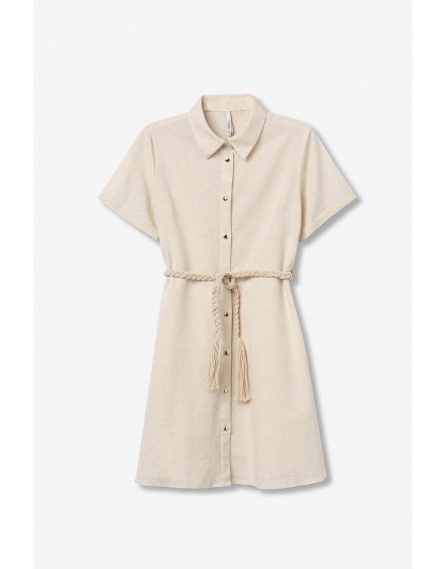 Early Vestido corto de color beige, corte regular, botones delanteros, manga corta y cinturón trenzado ajustable.87% VISCOSE 13% LINEN